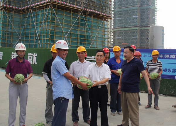 王思軍頂著烈日、冒著酷暑來到六安項目在建工地,與施工人員親切交談,詳細了解防暑降溫工作保障情況,將綠豆、西瓜、毛巾、清涼油等防暑降溫物品送到一線職工手中,希望各參建單位通力合作,全力實現人員安全、施工安全和質量安全。