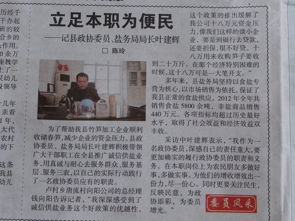為了幫助我縣竹筍加工企業(yè)順利收儲春筍,減少企業(yè)的資金壓力。縣政協(xié)委員、鹽務(wù)局局長葉建輝積極帶領(lǐng)廣大干部職工在全縣推廣誠信供鹽業(yè)務(wù),用真誠與耐心去服務(wù)群眾、服務(wù)基層、服務(wù)三農(nóng),以自己的實際行動踐行了一名政協(xié)委員應(yīng)有的職責(zé)。