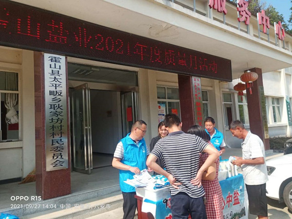 9月27日,霍山縣鹽業公司利用到太平畈鄉耿家坊村扶貧之際,結合鹽業發展公司《旺季市場營銷宣傳工作方案》“四進一參”相關要求,開展了“質量月”主題宣傳活動。